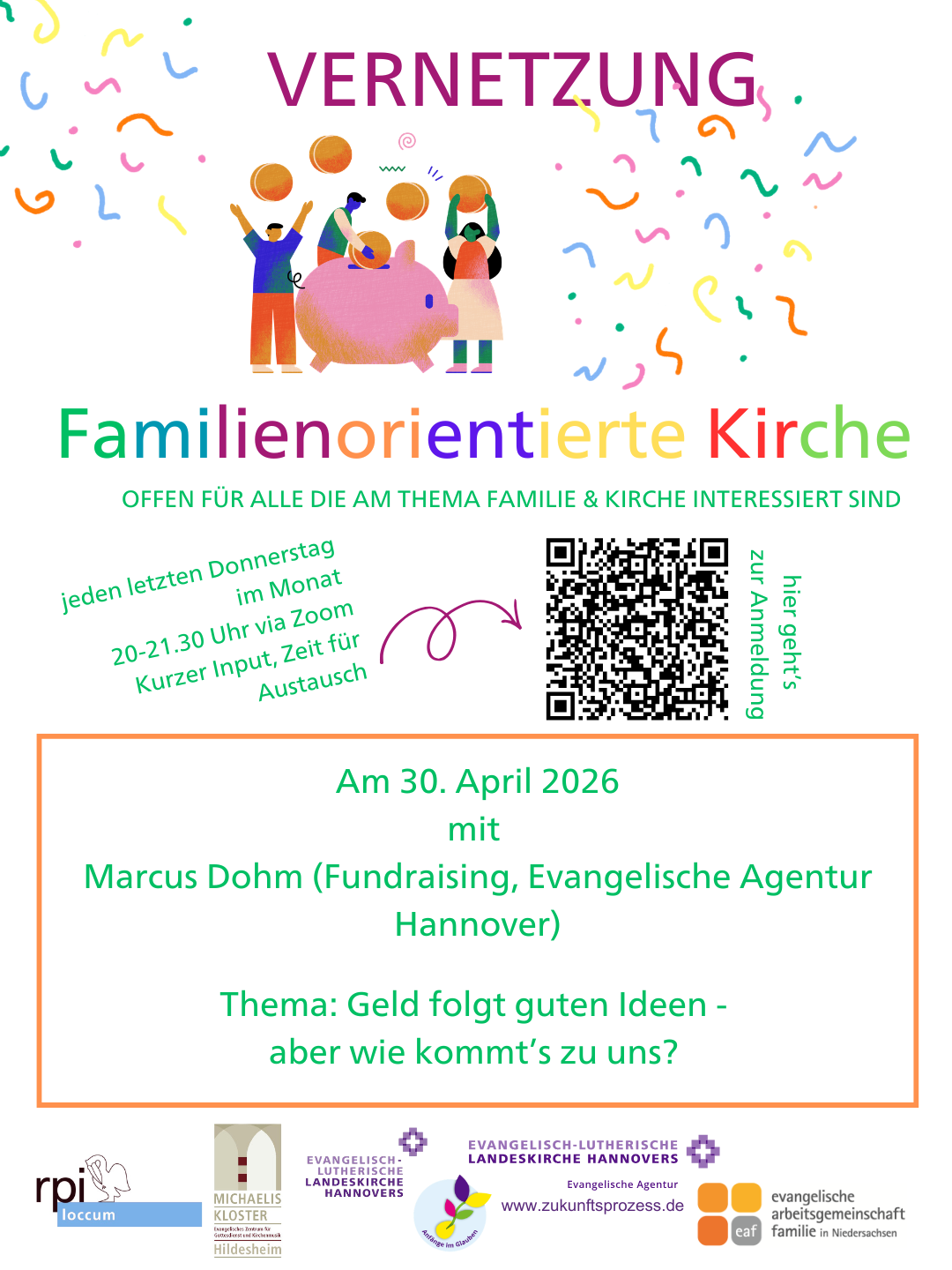 Parallel dazu baue ich als Koordinatorin ein landeskirchenweites Netzwerk Familienorientierung auf. Herzstück wird ein monatliches digitales Treffen sein – jeweils am letzten Donnerstag im Monat von 20:00 bis 21:30 Uhr. Das Format verbindet einen kurzen fachlichen Impuls mit Austausch und Vernetzung. Zudem sollen hier Erkenntnisse aus den Pilotkirchenkreisen geteilt werden.